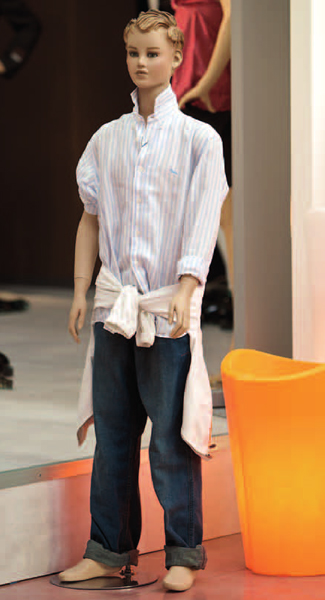 Manichini in vetroresina alto spessore verniciati in tinta carne con testa, make up e parrucca con calotta rigida; pedana rotonda in vetro temperato e doppio attacco piede/polpaccio per l’inserimento di calzature.