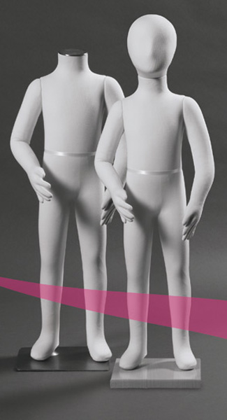 Volto: Manichino bambino flessibile, bambino,completo di base tonda cromata, con o senza testa. Rivestimento in spugna color avorio.
