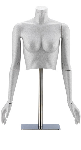 Manichino donna poliuretanico grigio chiaro super snodato. completo di base in metallo. Corredato da terminale superiore per poterlo utilizzare anche senza testa.