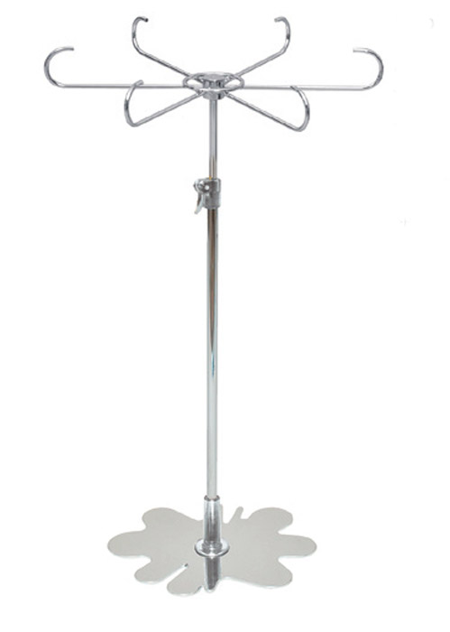 Espositore da banco per collane, bigiotteria o piccoli accessori blisterati che si agganciano ai raggi della corona circolare. Regolabile in altezza. L’espositore puo essere fornito con base cromata. L’asta regolabile viene fornita sempre cromata.
